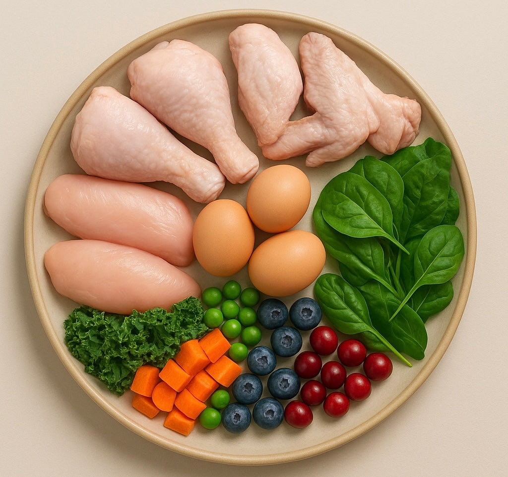 Chicky offers a complete meal made with fresh chicken, rich in digestible protein. It is enhanced with nutritious offal, ground bones, fresh vegetables, fruits, and essential oils for a balanced intake of vitamins and minerals.